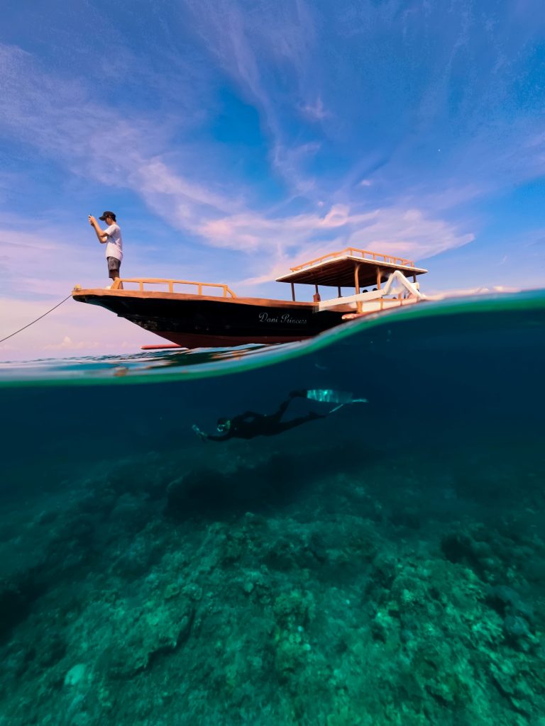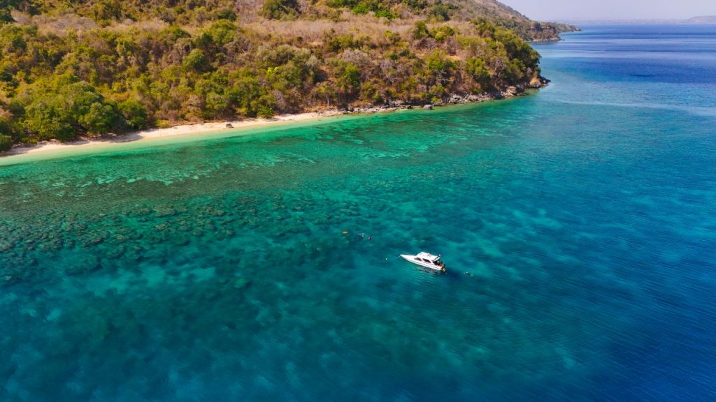 The journey to Poto Jarum Beach is part of an unforgettable adventure. From Sultan Muhammad Kaharuddin Airport in Sumbawa, travelers continue to Goa Beach Pier or Badas Pier before crossing by speedboat for approximately forty minutes. Along the way, visitors are treated to stunning blue seas and the distinctive landscapes of Moyo Island.